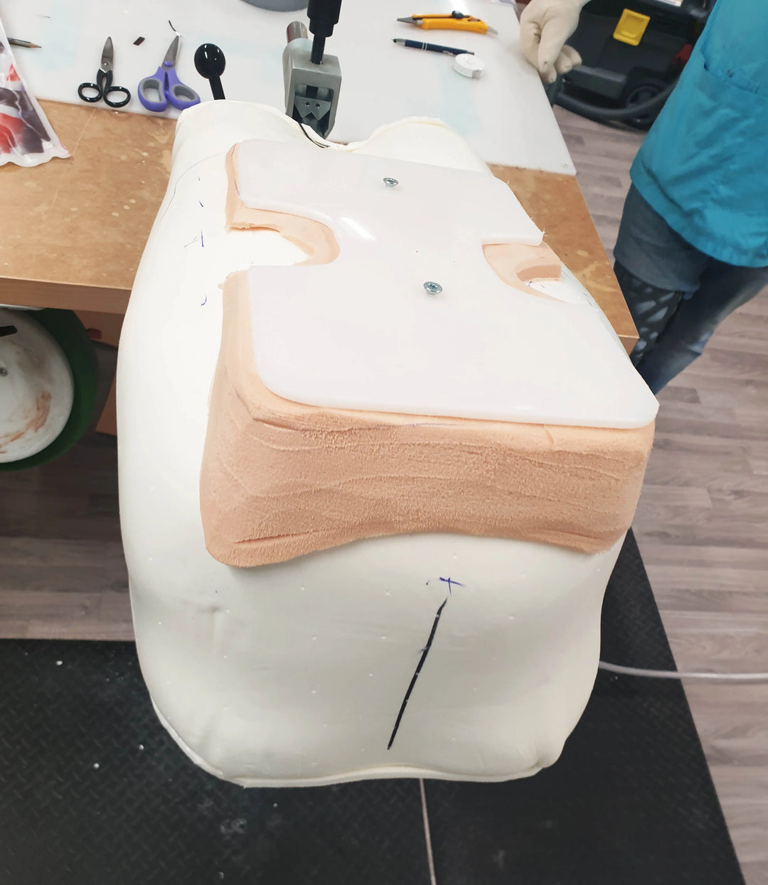 Spilleren har en skjevhet nederst i korsryggen, som det formstøpte setet tar hensyn til. Det formstøpte setet følger samtidig spillerens kroppsform både i hoftebredde og form på setepartiet.