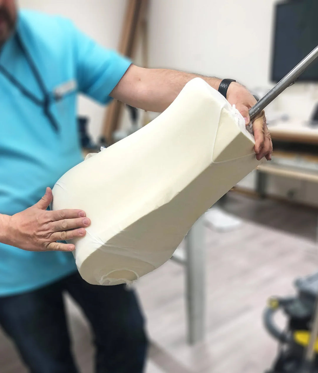 Ved hjelp av 3D-scan'en får vi laget en form som plasten skal brettes rundt, som tilslutt blir til et formstøpt sete.